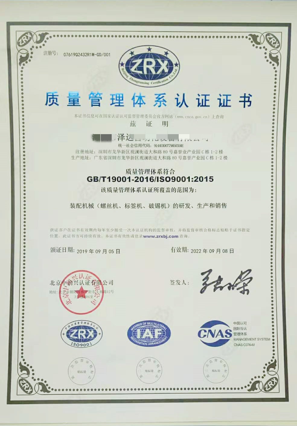 螺絲機專業(yè)生產(chǎn)廠家已通過ISO9001質量管理體系認證